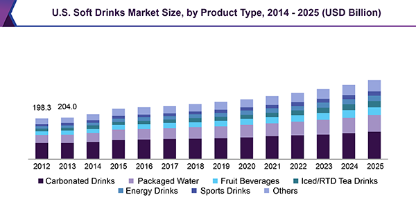 The U.S. soft drinks market size is anticipated to reach USD 388.4 billion by 2025, according to a study conducted by Grand View Research, Inc., progressing at a CAGR of 5.1% during the forecast period. Growing population is providing a fillip to the food and beverage sector, which in turn is propelling the U.S. soft drink market. Furthermore, easy availability and low price of soft drinks are benefiting the growth of the market. Recently, significant growth has been observed in the RTD tea drinks segment of the market, owing to soaring health concerns among consumers and increasing demand for premium products.