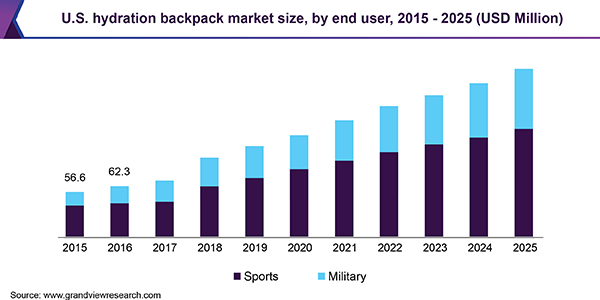 The global hydration backpack market size is anticipated to reach USD 701.9 million by 2025 registering a CAGR of 12.4%, according to a new report by Grand View Research, Inc. Increasing number of hiking enthusiasts, especially in emerging economies, such as India, China, and Brazil, is expected to assist in market growth over the forecast period. Moreover, rising awareness about maintaining a healthy lifestyle has led to increased participation in various outdoor activities, such as cross country running and walking, thereby fueling the product demand.