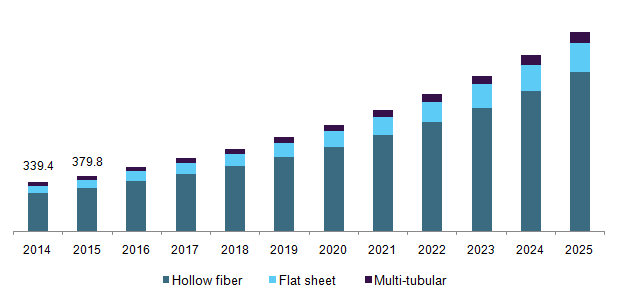 - Flat sheet MBR is expected to witness significant rise at a CAGR of 18.5% from 2017 to 2025 as a result of increasing adoption in the medium-scale industrial wastewater treatment plants. Moreover, increasing usage in the food & beverage sector owing to its high solid loading and good hydraulic flow behavior is anticipated to fuel demand.