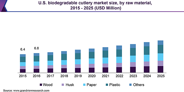 The global biodegradable cutlery market size is expected to reach USD 50.7 million by 2025, according to a new report by Grand View Research, Inc., expanding at a CAGR of 5.9% over the forecast period. Implementation of stringent regulations pertaining to non-biodegradable plastic across the globe is a primary factor likely to drive the market over the forecast period.