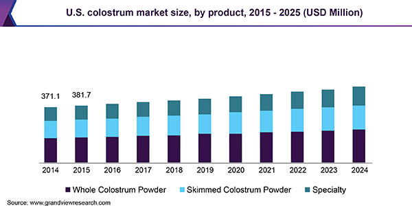 The global colostrum market size is expected to reach USD 1.84 billion by 2025, according to a new report by Grand View Research, Inc. It is anticipated to register a CAGR of 3.9% during the forecast period. Colostrum acts as a natural vaccine to newborn babies which helps effective growth of brain and eyes during premature stage. They are easily digestible and boost immunity. Hence, they are consumed as superfoods to ensure simplified first bowel movement, promoting sound sleep, and prevention of stomach infection.