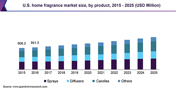 - By product,candles are expected to register a CAGR of 4.1% from 2019 to 2025, followed by diffusers with a CAGR of 3.9%. Sprays dominated the global market with a revenue share of 33.6% in 2018