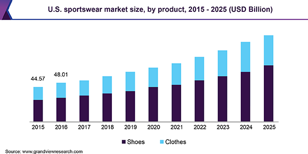 The global sportswear market size is anticipated to reach USD 479.63 billion by 2025 registering a CAGR of 10.4%, according to a new report by Grand View Research, Inc. The market is driven by rise in demand for trendy and comfortable sports shoes and clothes. Increasing participation in sports and fitness activities due to rising awareness about leading a healthy lifestyle is another major factor driving the market. Fitness activities help overcome stress related issues, such as obesity, heart diseases, depression, asthma, and diabetes.