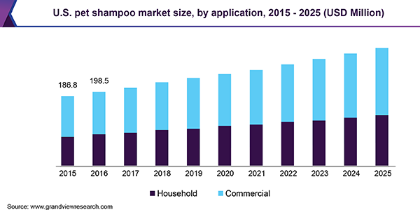 The global pet shampoo market size is expected to reach USD 757.7 million by 2025, according to a new report by Grand View Research, Inc. It is anticipated to register a CAGR of 6.4% during the forecast period. Increasing rate of pet adoption among millennials is expected to remain a key growth driver. In addition, rising awareness about animal health and hygiene among the pet owners is expected to fuel the product demand.