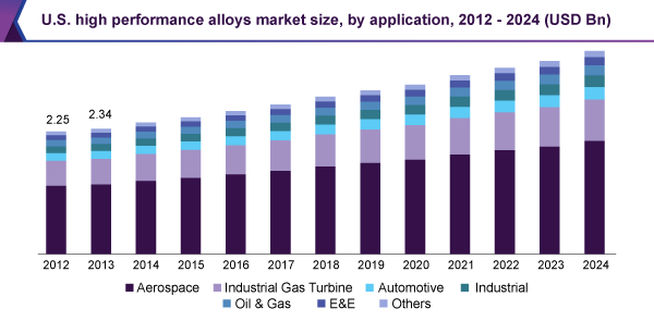 The global high performance alloys market size is expected to reach USD 11.34 billion by 2024, according to a new report by Grand View Research, Inc. The industry is anticipated to grow, primarily on account of rising substitution of materials such as steel and aluminum due to superior performance and reduction in the price of such alloys.