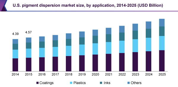 The U.S. pigment dispersion market size is expected to reach USD 7.08 billion by 2025, according to a new report by Grand View Research, Inc., exhibiting a CAGR of 4.6% during the forecast period. Pigment dispersions are insoluble coloring agents used to impart color to various materials and can be classified into organic and inorganic types. Various pigment dispersions are available in the market and their choice depends on specific applications desirable in end-use industries.