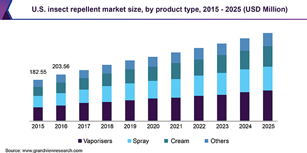 The global insect repellent market size is expected to reach USD 5.8 billion by 2025, expanding at a CAGR of 7.0% in the forecast period, according to a new report by Grand View Research, Inc. Increasing pests due to global warming results in rise in the number of insect borne diseases, which is a prominent factor propelling the market growth.