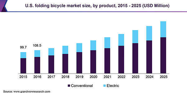 The global folding bicycle market size is expected to reach USD 926.9 million by 2025, according to a new report by Grand View Research, Inc., expanding at a CAGR of 8.8% over the forecast period. Rising importance of cycling as a recreational activity among the millennials in order to improve body fitness is expected to have a strong impact on the market growth. Furthermore, governments of various countries including U.S., Germany, U.K., and Spain are propelling corporate institutions to spread awareness among their employees regarding using bicycle for daily transportation. This, in turn, is expected to promote the scope for folding bicycle over the next few years.