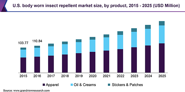 The global body worn insect repellent market size is expected to reach USD 659.01 million by 2025, according to a new report by Grand View Research, Inc. It is anticipated to register a CAGR of 9.06% during the forecast period. Rising prevalence of infectious diseases caused by insect bites is anticipated to drive the product demand. The market is driven by the rising use of products such as oils, creams, and patches for protection from harmful bites of insects.