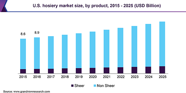 The global hosiery market size is expected to reach USD 44.2 billion by 2025, according to a new report by Grand View Research, Inc., expanding at a CAGR of 4.0% over the forecast period. Shifting inclination of the consumers towards apparel with excellent functional and fashionable characteristics is expected to promote the use of hosiery. It has been observed that many hosiery products are used by the people who are suffering from varicosities and leg disorders.