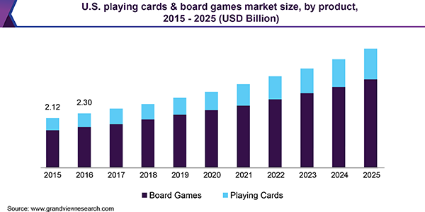 The global playing cards and board games market size is anticipated to reach USD 21.56 billion by 2025, according to a new report by Grand View Research, Inc. It is expected to expand at a CAGR of 8.7% during the forecast period. Growing popularity of traditional recreational activities among the younger generation is projected to drive the market. Rising preference of millennials for old school games during social gatherings is expected to further fuel the growth.