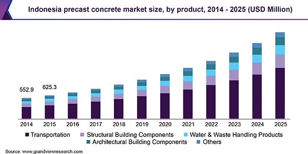 The Indonesia precast concrete market size is expected to reach USD 2.32 billion by 2025, registering a CAGR of 14.2% over the forecast period, according to a new report published by Grand View Research, Inc. Growing construction expenditure for public infrastructure development in the country is predicted to boost the growth.