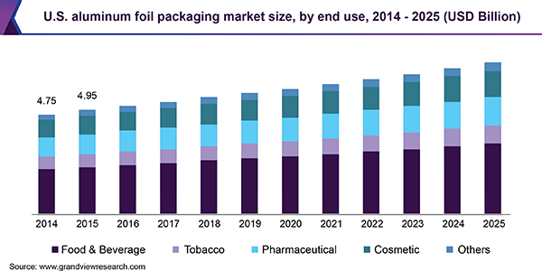 The global aluminum foil packaging market size is estimated to reach USD 46.19 billion by 2025, exhibiting a revenue-based CAGR of 4.0% over the forecast period, according to a new report published by Grand View Research, Inc. Increasing demand for packaged food coupled with rapid rise of the pharmaceutical packaging industry is anticipated to drive the growth. Aluminum is infinitely recyclable and contributes to sustainable packaging solutions, which is expected to further drive the market.