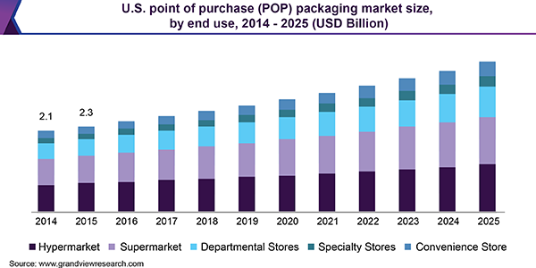 The global point of purchase packaging market size is estimated to reach USD 16.2 billion by 2025, expanding at a CAGR of 5.6%, according to a new report by Grand View Research, Inc. Growing organized retail market in emerging economies is driving the Industry. Growing adoption of point of purchase packaging in organized retail stores, including Walmart, D-mart, and Tesco, is observed owing to implementation of structured marketing strategies at these stores.