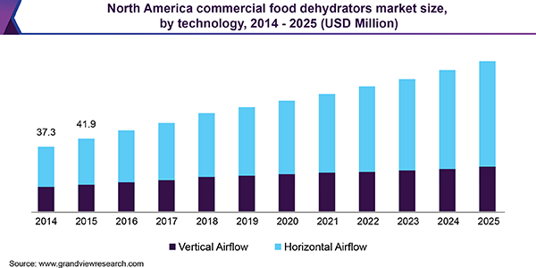 The global commercial food dehydrators market size is anticipated to reach USD 868.4 million by 2025, according to a new report by Grand View Research, Inc., registering a CAGR of 7.1% over the forecast period. Growing demand for eatables with an improved shelf life is expected to boost the product demand over the forecast period. In addition, increasing awareness pertaining to the benefits associated with food dehydrators is expected to drive the market.