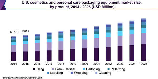 The global cosmetics and personal care packaging equipment market size is anticipated to reach USD 5.6 billion by 2025, according to a new report by Grand View Research, Inc. It is expected to exhibit a CAGR of 5.4% over the forecast period. The growth is backed by the rising consumer preference for healthier and personalized products along with the rising investments in developing novel and innovative packaging technologies.