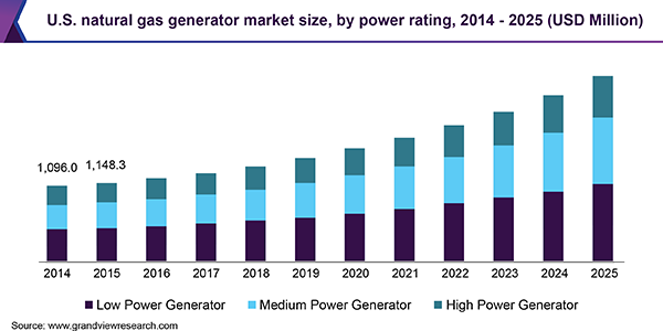 The global natural gas generator market size is projected to reach USD 10.87 Billion by 2025, registering a CAGR of 10.7% over the forecast period, according to a new report by Grand View Research, Inc. growing demand for back-up power coupled with increasing government regulation to reduce the carbon emission caused by diesel generator is likely to strengthen the growth for the natural gas genset market during the forecast period.