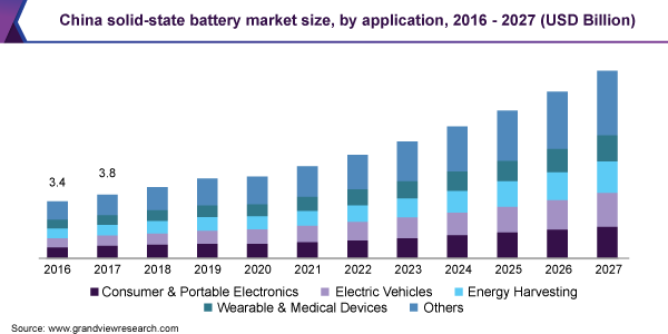The global solid state battery market size is expected to reach USD 87.5 billion by 2027, escalating at a CAGR of 13% over the forecast period, according to a new report by Grand View Research, Inc. Growing demand for solid-state batteries across end-use markets along with rising R&D focused on developing advanced batteries is likely to drive the market growth over the forecast period.