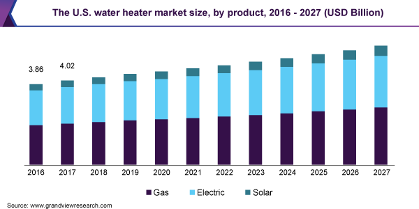 The global water heater market size is expected to reach USD 37.52 billion by 2027, accelerating at a CAGR of 4.0% over the forecast period, according to a new report by Grand View Research, Inc. The augmenting residential housing sector coupled with rising disposable income is anticipated to bolster the global market growth.