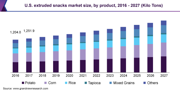 The global extruded snacks market size is expected to reach USD 74.52 billion by 2027, expanding at a CAGR of 4.7% over the forecast period, according to a new report by Grand View Research, Inc. Increasing consciousness among consumers regarding their snacking habits and rising adoption of healthy products during snacking time are the key factors boosting the market growth.