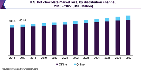 The offline distribution channel segment held a major share of exceeding 90.0% in 2019. High product availability at supermarkets and hypermarkets and convenience stores is expected to favor sales of hot chocolate through offline channel in coming years. While the popularity of online sales channel is steadily growing, around 83% of consumers prefer offline channel as it provides the leverage of feel, touch, and taste, thereby driving the sales of hot chocolate through offline channel.