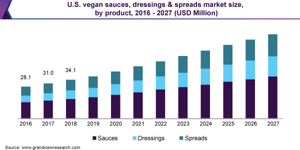 The global vegan sauces, dressings & spreads market size is expected to reach USD 365.8 million by 2027, expanding at a CAGR of 8.2% over the forecast period, according to a new report by Grand View Research, Inc. Rising adoption of vegan lifestyle owing to increasing awareness pertaining to adverse environmental effects of eating habits is expected to drive the market. New products launches have also been acting as a catalyst for the market growth.