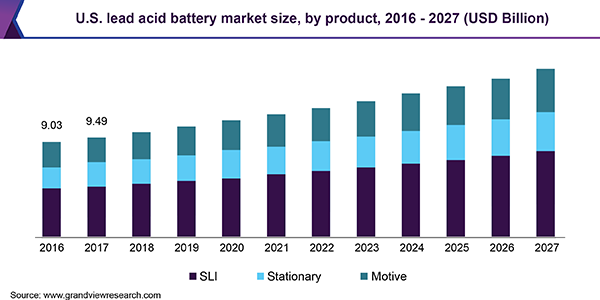 The global lead acid battery market size is expected to reach USD 93.04 billion by 2027, registering a CAGR of 5.9% over the forecast period, according to a new report published by Grand View Research, Inc. Lead acid batteries are expected to witness a significant rise in demand owing to their increasing usage in various industries including oil and gas, nuclear power, electricity generation, gas turbine, hospitality, transport infrastructure, manufacturing, construction, mining, and off-grid renewable. Moreover, advantages associated with these batteries, such as durability, high voltage capability, low-cost, and simple manufacturing processes are expected to increase the demand.
