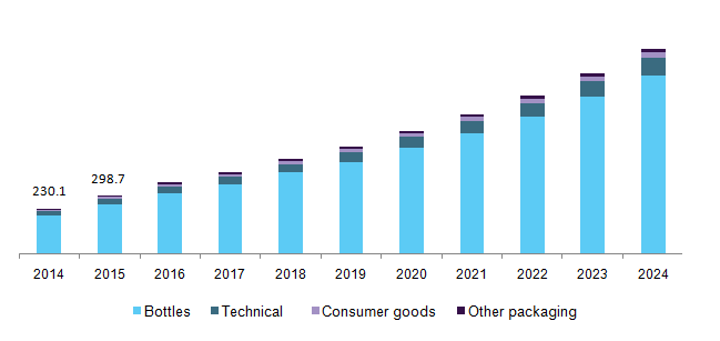 - Rapid industrialization across the Middle East is anticipated to drive the growth of various sectors such as construction, packaging, electronics, and automotive in the region which is expected to play a fundamental role in increasing the demand for bio-based PET over the next nine years. The market is estimated to be worth USD 241.6 million by 2025.