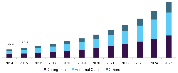 - North America emerged as the second major consumer in 2015. Product demand in detergent application in the U.S. is anticipated to exceed USD 185 million by 2025.