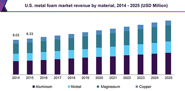 The global metal foam market is expected to reach USD 117.7 million in 2025, growing at a CAGR of 4.1%, according to a new report by Grand View Research, Inc. Metal foams have seen a vast spectrum of development in the recent years, with further intensified research being carried out on this multifunctional material class. Despite the various value-additions catered by metal foams, there still exists an imbalance between the properties offered and the substantial utilization. A major factor influencing this is the high cost of metal foams.
