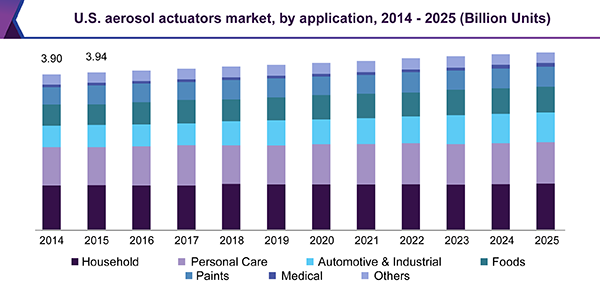 The global aerosol actuators market size is expected to reach USD 1.46 million by 2025, growing at a CAGR of 5.3%, according to a new report by Grand View Research, Inc. The market is expected to witness significant growth owing to increasing consumption for personal care products by the consumers due to increasing usage of self-grooming products.