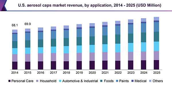 The global aerosol caps market size is expected to reach USD 440.5 million by 2025, growing at a CAGR of 4.7%, according to a new report by Grand View Research, Inc. Increasing demand for the product in aerosol used in personal care and household application is expected to drive growth.