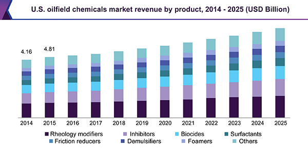 The global oilfield chemicals market size is expected to reach USD 28.48 billion by 2025, growing at a CAGR of 4.3%, according to a new report by Grand View Research, Inc. The increasing demand for crude oil is likely to steer the oilfield chemicals industry growth over the projection period.