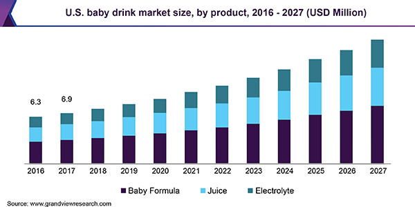 The global baby drinks market size is expected to reach USD 232.5 billion by 2027, expanding at a CAGR of 9.3%, according to a new report by Grand View Research, Inc. Rising working women population in the developing countries such as China and India is driving the market. Eventually, to save working time and efforts, working women are getting inclined towards the use of baby drinks to ensure baby care in terms of nutrition. For instance, 30% to 40% of the total women population is working in India. This has resulted in the increased demand for infant formula that meets the nutritional requirement in babies.
