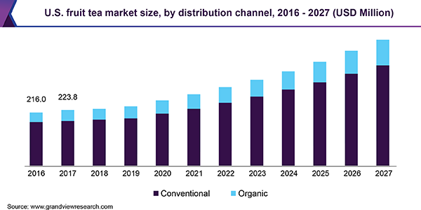 The global fruit tea market size is expected to reach USD 5.1 billion by 2027, expanding at a CAGR of 9.6% over the forecast period, according to a new report by Grand View Research, Inc. Shifting preference of consumers toward healthy and caffeine-free beverages is boosting the demand for the product across the world. Fruits teas have become a popular out-of-home beverage among health-conscious consumers and are gaining more traction as compared to the traditional black tea.