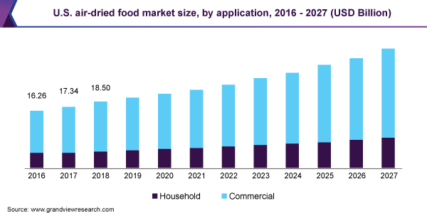 - The household application segment is expected to expand at the fastest CAGR of 7.5% from 2020 to 2027. Shifting preferences among millennials to cook food at home as a result of increased number of recipe videos posted on social media and satellite television channels is expected to prompt the demand for air-dried product forms as convenient options