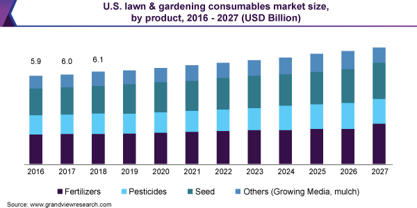 The global lawn & gardening consumables market size is anticipated to reach USD 25.94 billion by 2027, expanding at a CAGR of 3.6% over the forecast period, according to a new report by Grand View Research, Inc. Growing preference for landscaping and gardening activities across the residential, commercial, and industrial sectors is expected to drive the market for lawn and gardening consumables.