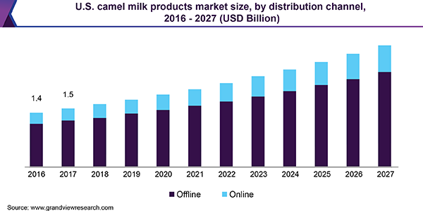 - In terms of distribution channel, offline sales led the camel milk products market, contributing for more than 80% of the global revenue