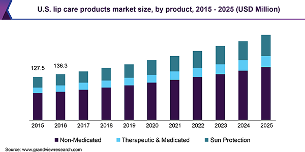 The global lip care products market size is expected to reach USD 1.18 billion by 2025, exhibiting a CAGR of 7.2% over the forecast period, according to a new report published by Grand View Research, Inc. Rising consciousness regarding personal grooming among millennials and working-class population coupled with high demand for innovative products from women is projected to drive the market. In addition, a steady rise in the adoption of basic personal care products in a daily routine by men is expected to bode well for the growth. Moreover, the rising influence of media on beauty perception is anticipated to boost the product demand.
