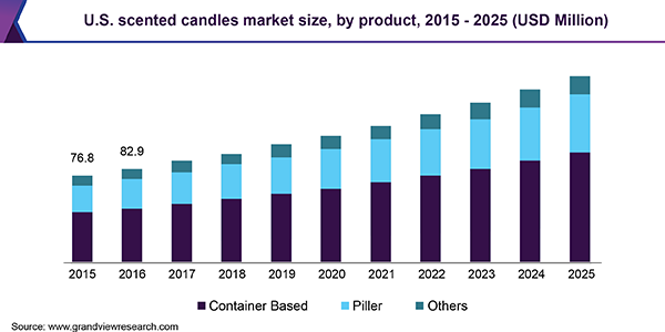 The global scented candles market size is expected to reach USD 545.2 million by 2025, expanding at a CAGR of 8.4%, according to a new report by Grand View Research, Inc. Shifting traction towards various therapeutic procedures including aromatherapy, massage, and spa in order to relax human’s body is expected to expand the market and scope for scented candles. Additionally, organically prepared scented candles to play a unique role in aromatherapy as they act as diffusers for fragrances, which can be inhaled easily by consumers.