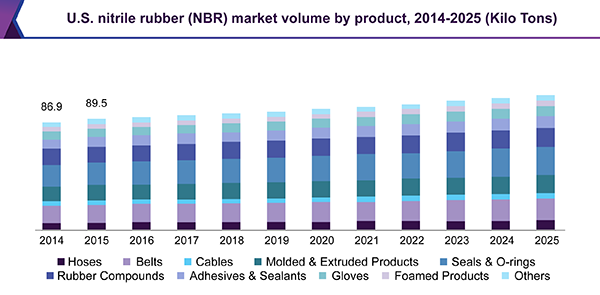 The global nitrile butadiene rubber market size is expected to reach USD 2.59 billion by 2025, growing at a CAGR of 3.3%, according to a new report by Grand View Research, Inc. Asia Pacific is expected to provide ample scope for the industry growth of nitrile butadiene rubber (NBR) by the end of 2025. China, India, and Southeast Asian countries are likely to reflect a strong growth scenario in the future.
