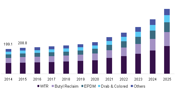 Burgeoning demand for whole tire reclaim (WTR) is anticipated to drive segment volume demand by 42% by 2025. Owing to its versatility, durability, reduced pollution, and low processing costs, WTR is expected to witness growth over the forecast period. However, the emergence of innovative elastomer-based products has restricted the full growth potential of this segment.
