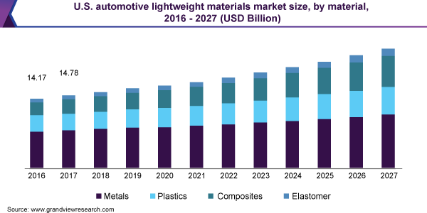 The global automotive lightweight material market size is expected to reach USD 105.4 billion by 2027, according to a new report by Grand View Research Inc., expanding at a CAGR of 5.9% from 2020 to 2027. A rise in demand for weight reduction in passenger cars and commercial vehicles to support fuel efficiency is expected to ascend the demand for lightweight materials over the forecast period.