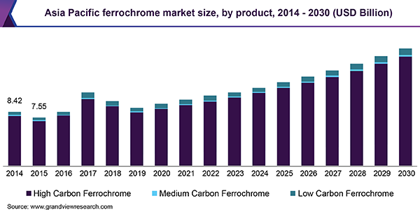 The global ferrochrome market size is anticipated to reach USD 28.83 billion by 2030,expanding at a 4.6% CAGR during the forecast period, according to a new report by Grand View Research, Inc. The market is mainly driven by demand from booming stainless steel industry especially in Asia. Stainless steel industry accounts for roughly more than 75% of the FeCr consumption in the globe. China, being the largest stainless steel producer is therefore also the biggest consumer of FeCr.