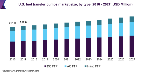 The global fuel transfer pump market size is expected to reach USD 2.4 billion by 2027, expanding at a CAGR of 4.3%, according to a new report by Grand View Research, Inc. The growth of the market can be attributed to the increasing product demand in several applications, including transportation, chemical, food and beverages, and construction.