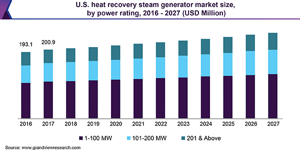 The global heat recovery steam generator market size is expected to reach USD 1.6 billion by 2027, expanding at a CAGR of 3.2%, according to a new report by Grand View Research, Inc. Shifting preference from simple cycle power plants to combined cycle power plants, with increase in adoption of energy-efficiency measures is anticipated to drive the market for heat recovery steam generator (HRSG) during the forecast period.