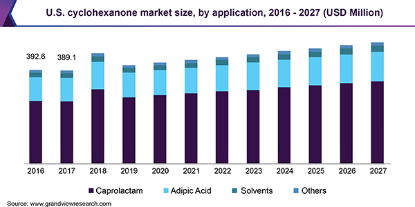 - U.S. was the second-largest consumer of cyclohexanone after China in 2019 and is anticipated to register a CAGR of 2.6%, from 2020 to 2027, owing to the rising production of caprolactam in the country