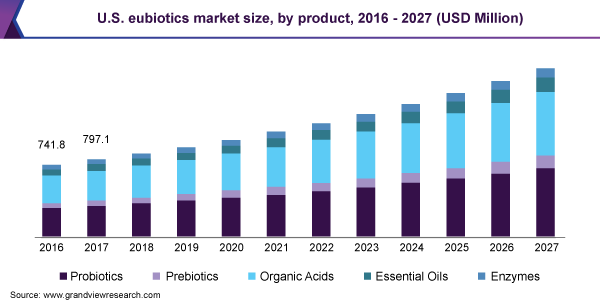 The global eubiotics market size is anticipated to reach USD 11.1 billion by 2027, expanding at a CAGR of 8.1%, according to a new report by Grand View Research, Inc. The growth in the market can be attributed to concerns over antibiotic traces in animal meat and their health hazards. Eubiotics also provides benefits such as increased feed conversion ratio, resistance to diseases, and better animal welfare. All these factors are expected to propel market growth over the forecast period.
