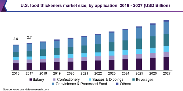 The global food thickeners market size is expected to be valued at USD 20.9 billion by 2027, expanding at a CAGR of 6.0%, according to a new report by Grand View Research, Inc. This growth in the market can be majorly ascribed to its end-use applicability in bakery, confectionery, ready to eat products, and beverages.