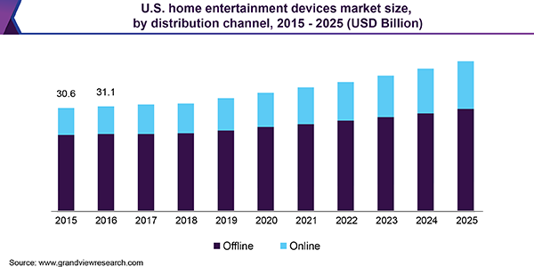 The global home entertainment devices market size is expected to reach USD 345.2 billion by 2025, according to a new report by Grand View Research, Inc., registering a CAGR of 6.3% over the forecast period. Consumer preference for systems such as televisions as a medium for entertainment is expected to be a crucial factor driving the growth of the market during the forecast period.